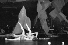 A lot of Jasperse’s characteristic movement is shaped into prone phrases, like his opening solo, where he inches his lanky body across the stage like a caterpillar, while the other dancers take turns zapping the cloud with blasts from electric leaf blowers, causing it to do its own lumbering choreography in midair. Harsh scoop lights, designed by Joe Levasseur and Jasperse, throw the moving shadow of the sculpture on the floor.