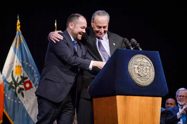City Council Speaker Corey Johnson with Senator Chuck Schumer, who administered Johnson’s official oath of office at an FIT ceremony on January 28. | CHRISTIAN MILES