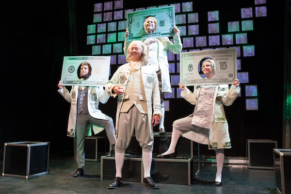 In the opening number, Franklin cavorts with his compatriots Washington, Lincoln, and Hamilton, dressed as their respective bill denominations. “Men may claim they worship God, but I’m their true religion,” they sing, with equal measure of chagrin and rancor. The irony that these great men have been reduced to crude legal tender is not lost on them.