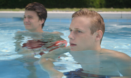 Henry grapples with his unspoken desires in the pool, especially underwater, where he can silently observe the objects of his affection. Doman, who has been a competitive swimmer, embraced being in the water for the film, despite shooting during “a cold summer.” He thought of the pool scenes where Henry could stare at Gabe or Logan as “a private space, for him to think, like a bathtub or shower. But in a pool, where there are lots of bodies, Henry is being forced to see things that he wasn’t seeing before. These other bodies are in his space — and they are shirtless.”
