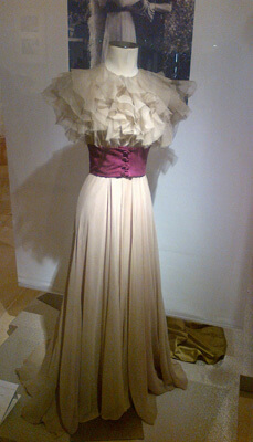 At a panel the night before, Cohen-Stratyner rather shocked the audience of hard-core Kate-philes when she confessed to never having liked Hepburn as an actress and mistakenly stated that she had broken her RKO contract to appear on Broadway in her famous disaster, “The Lake.” That benighted Jed Harris-directed production is represented by a Howard Greer wedding gown, superbly Deco-architectural in silhouette.