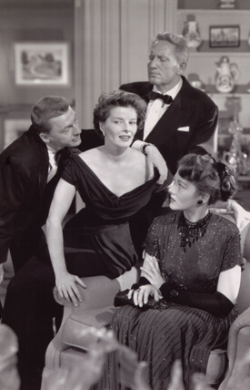 Walter Plunkett’s off-the-shoulder, black jersey evening gown for Katharine Hepburn (seen with David Wayne, Spencer Tracy, and Eve March) in “Adam’s Rib” (1949). | CLARENCE SINCLAIR BULL/ KENT STATE UNIVERSITY MUSEUM/ GIFT OF CHRISTOPHER P. SULLIVAN, M.D.
