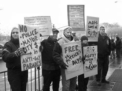 Protests against the parade were spearheaded in early years by ILGO, the Irish Lesbian and Gay Organization. In the past several years, however, the most vigorous display of dissent has come from Irish Queers, an ad hoc contingent of activists eager to shake up what had become a relatively complacent staged civil disobedience action. This year, the group assembled at 56th Street and Fifth Avenue, in front of FAO Schwarz.