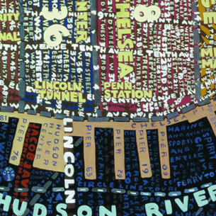 Scher paints her very big maps in a very small room at the country house she and her husband, Seymour Chwat, an artist, have in Connecticut. Every so often Chwat wanders in to where she’s working, takes a look, and tells her she’s spelled this name or that name wrong.