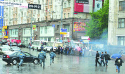 Police and a phalanx of the dreaded OMON—Russia’s anti-riot police—then encircled both the gay demonstrators and the fascists attacking them. Scott Long, Human Rights Watch’s director of LGBT affairs, who was in the middle of the gay group, recounted that, “The police let the extremists in to beat and terrorize the lesbians and gays, then coursed in to drive the skinheads out. The skinheads kept tangling with the lesbians and gays as the cops compressed them. Then the cops released the pressure and they all broke loose, a melee surging from the [Alexander] Garden into Manezhnaya Square.”