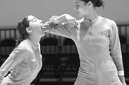 Toward the end, the dancers walk slowly around the perimeter, making eye contact with each audience member and shaking hands with some, forcing our acknowledgement of the intimacy of their presentation and our complicity in it. Finally, Rachael Osborne and Caroline Boussard’s duet of mutual supporting ends with one woman clasping the other’s elbow in her teeth.