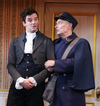 Michael Urie and Arnie Burton in Nikolai Gogol’s 1836 Russian farce “The Government Inspector,” adapted by Jeffrey Hatcher and directed by Jesse Berger, at the Duke on 42nd Street through June 24. | CAROL ROSEGG